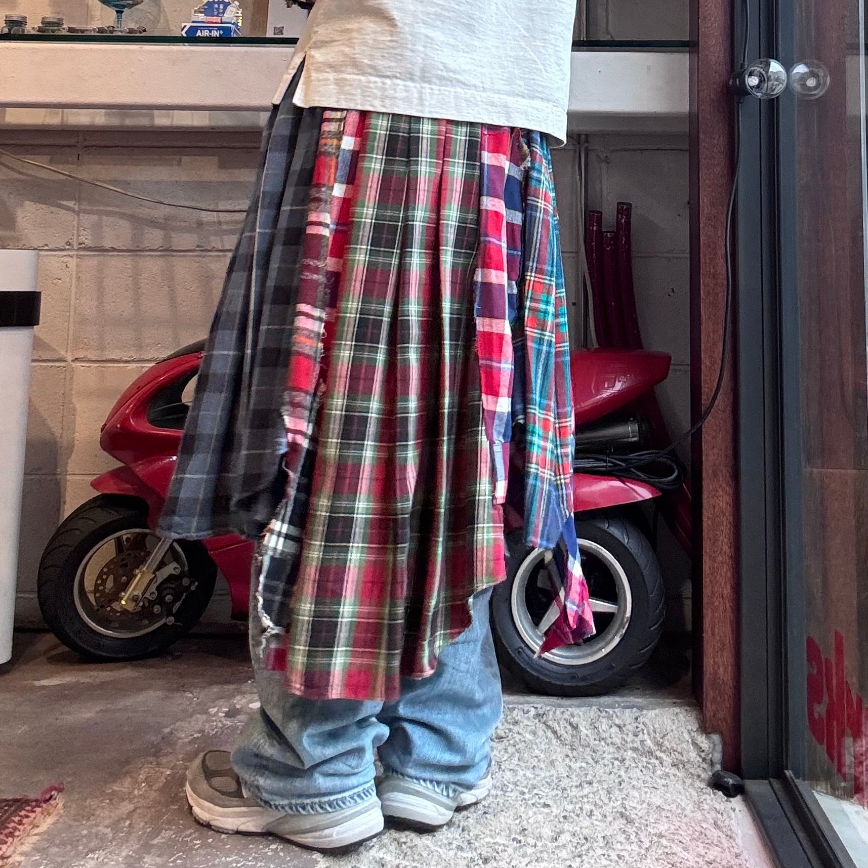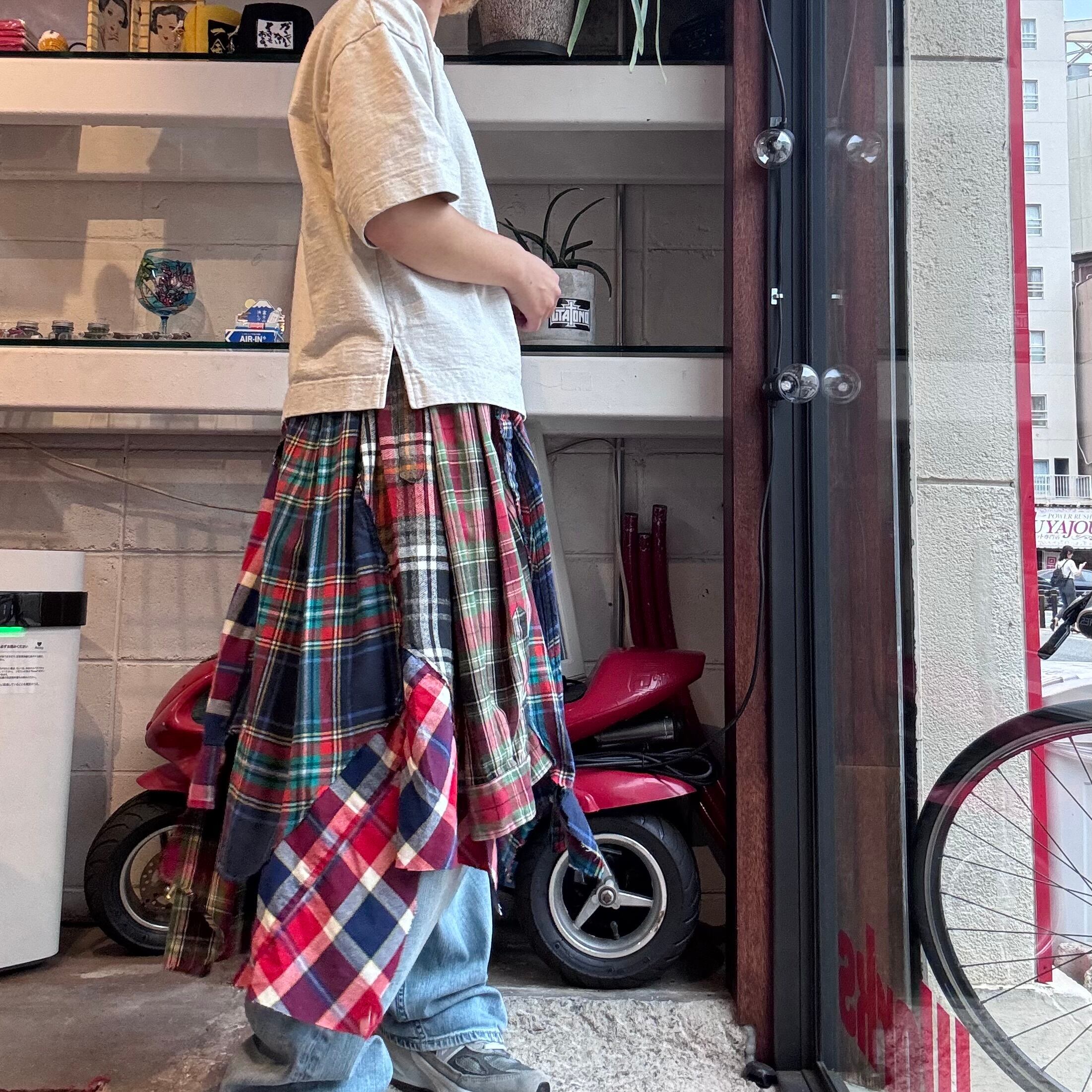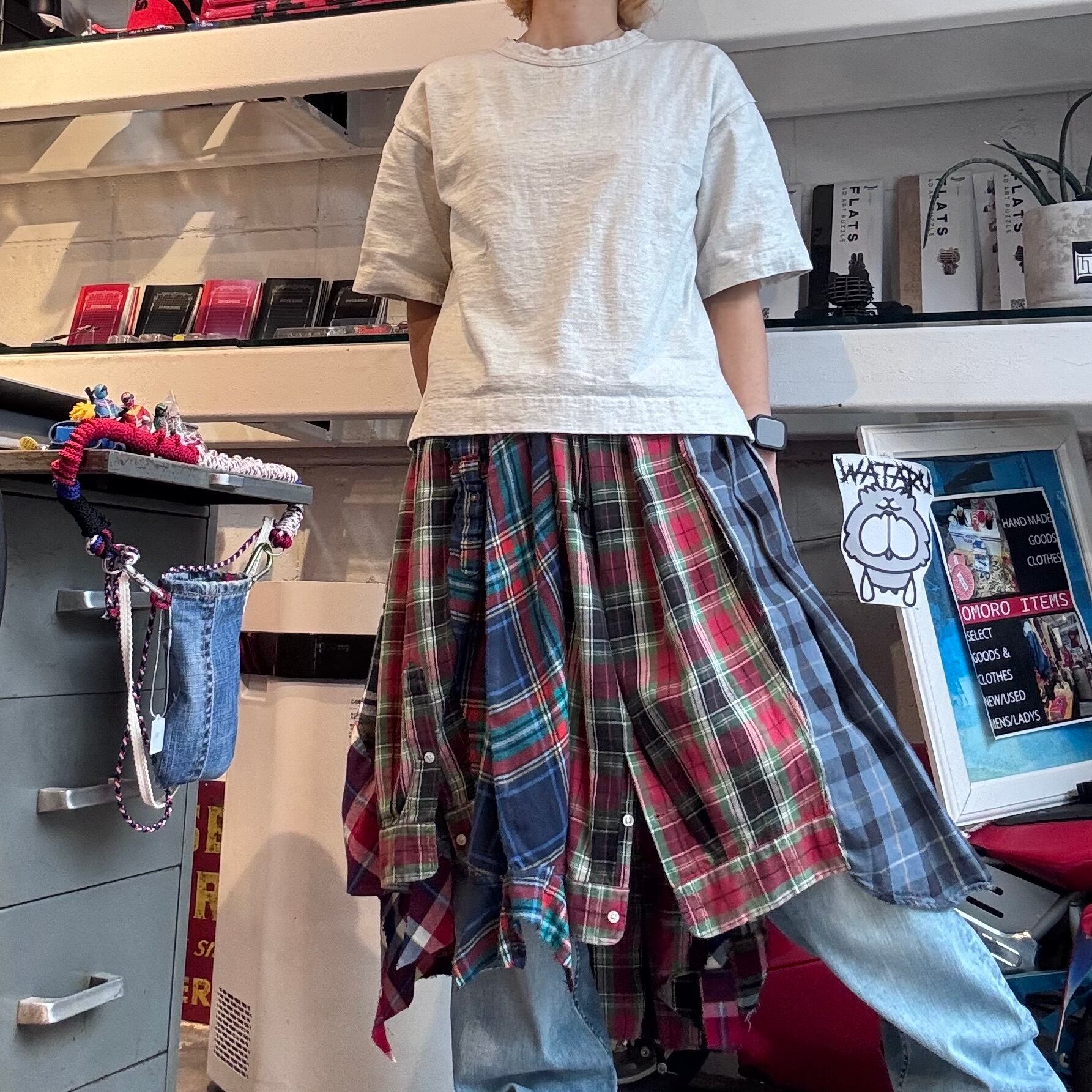 古着のチェックシャツを大胆に解体・再構築したリメイクスカート。