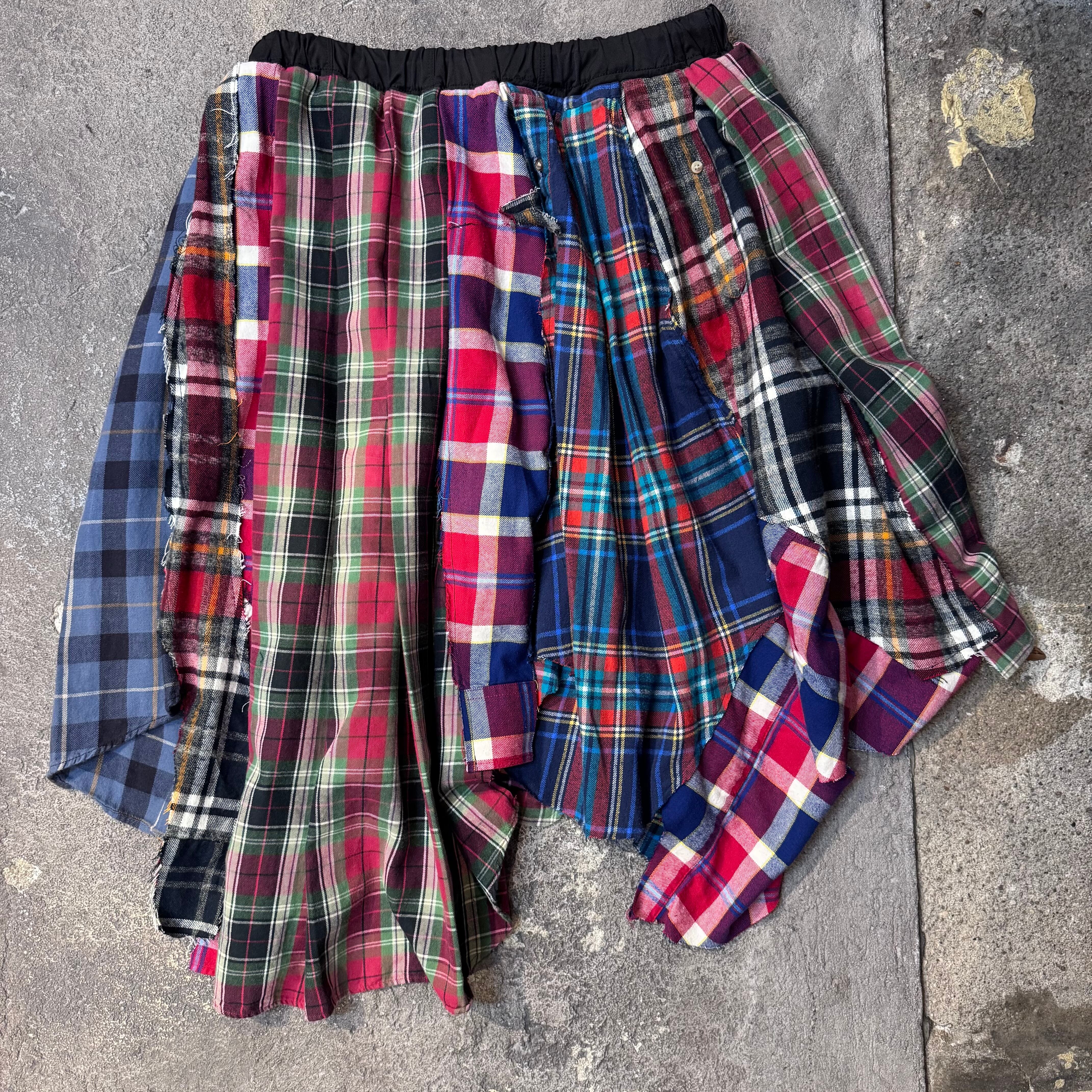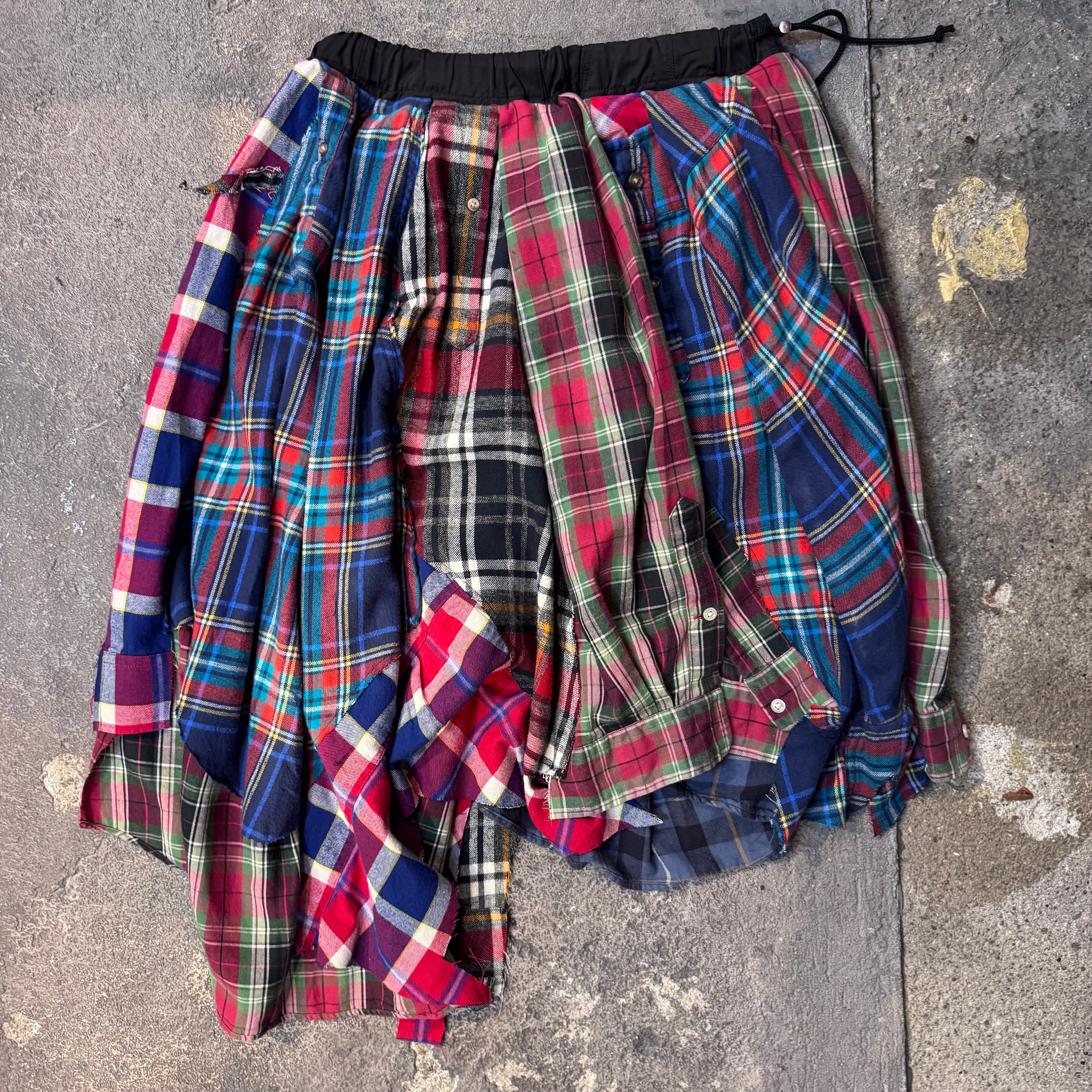 A remake skirt rebuilt from multiple vintage check shirts.