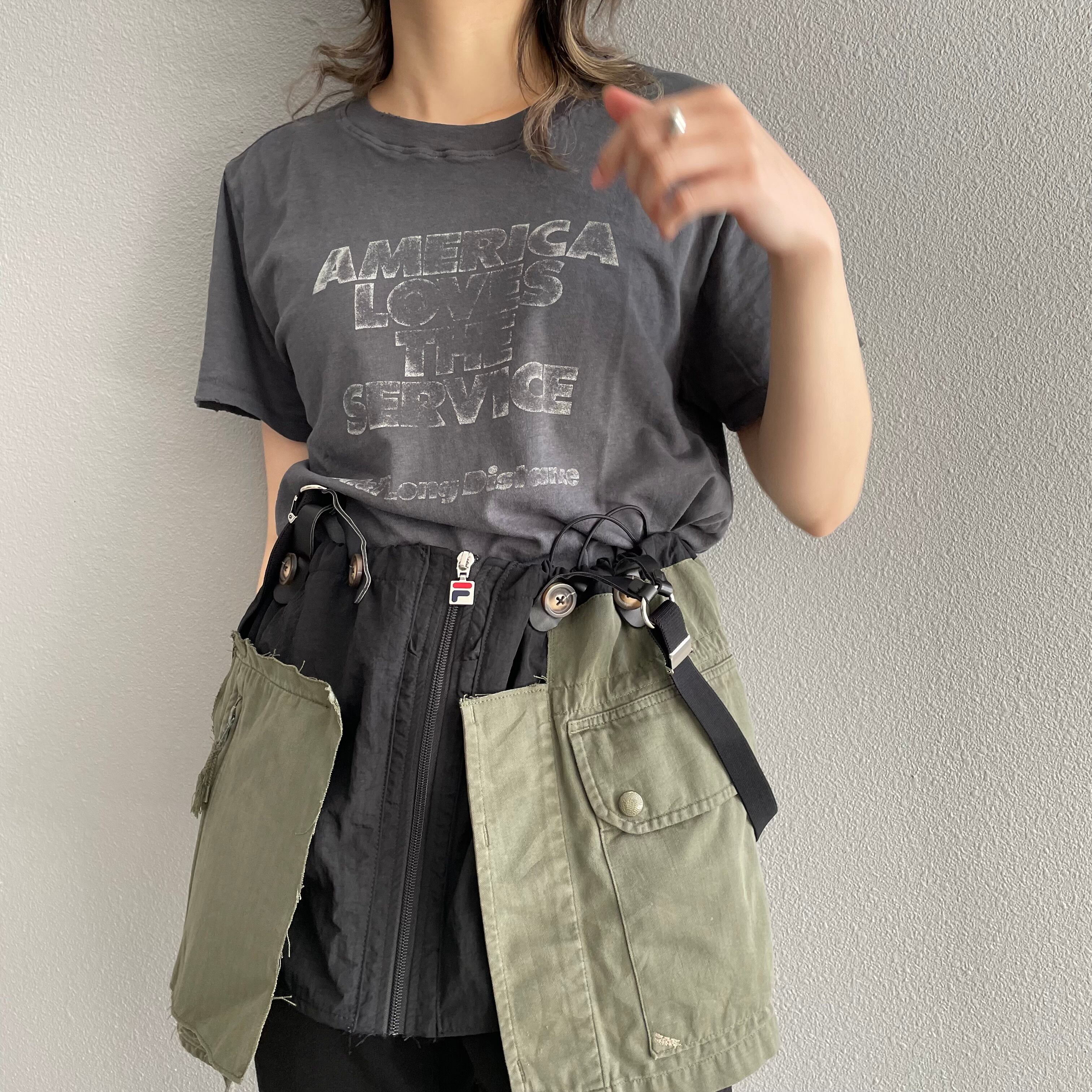 軍服とナイロンアウターを解体し、再構築したビスチェサロペット。
